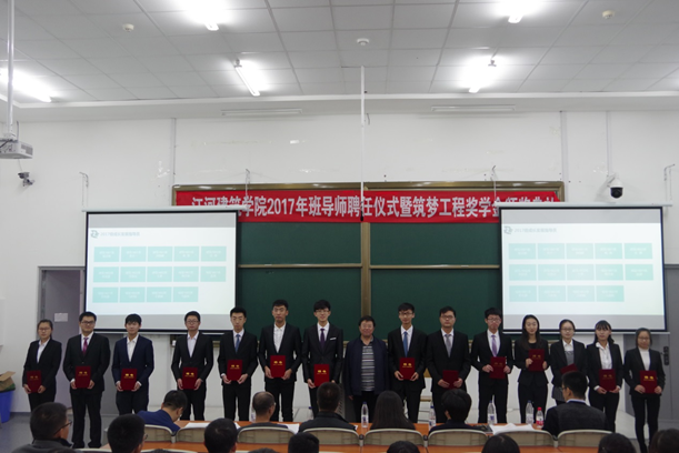 2017年10月11日,江河建筑学院2017年班导师聘任仪式暨筑梦工程奖学金颁奖典礼在建筑学馆A302成功举行,学院党委书记安立鸿、学院副院长曲艺、学院党委副书记兼副院长徐长文、城乡规划系主任高雁鹏受邀出席。