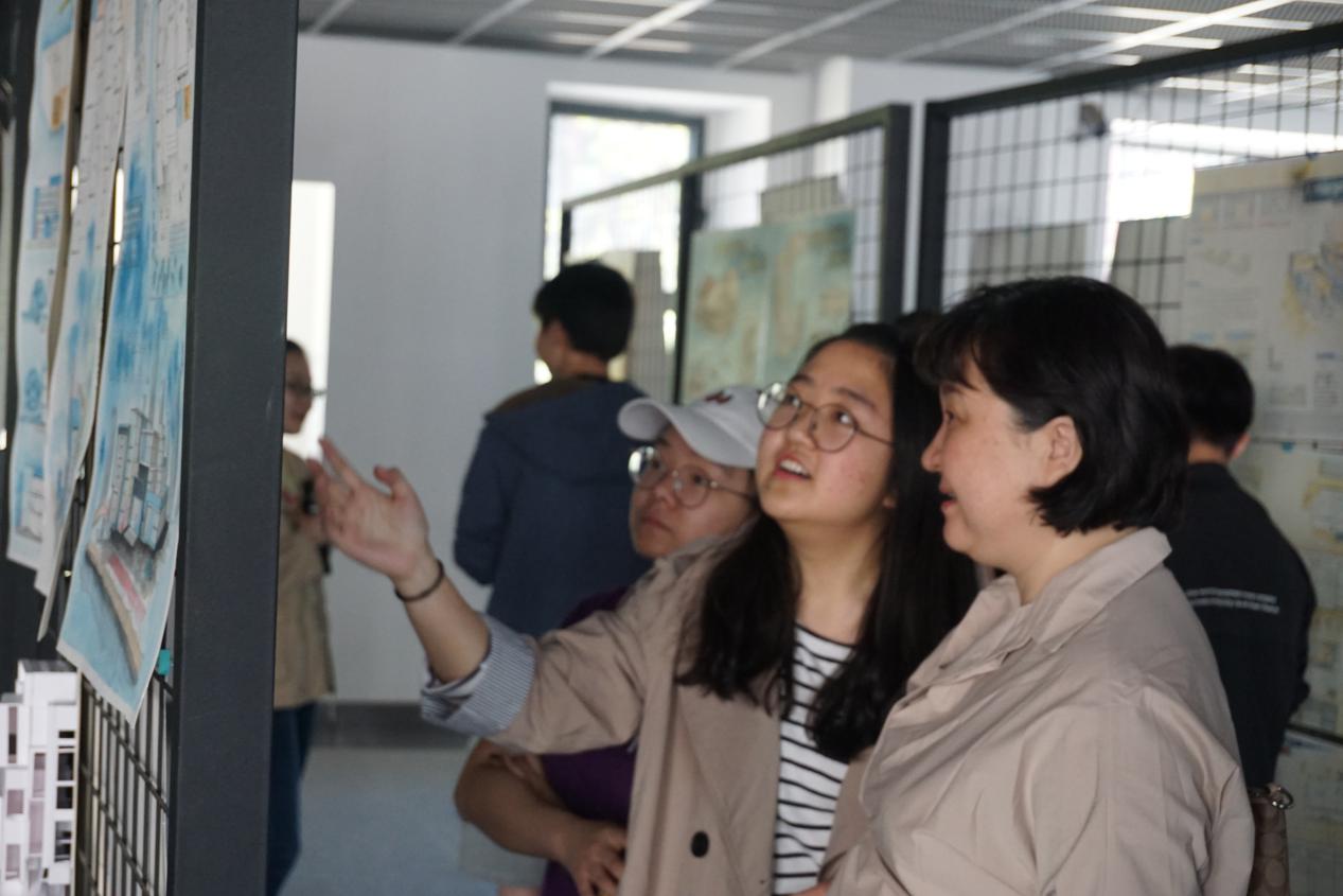 首先由专家和教师对建筑馆一楼评图区内作品进行打分,打分结束后师生共同针对设计初衷和设计理念展开深入探讨,各位专家、教师耐心为学生答疑解惑,在处理手法、方案展示技巧等方面进行了经验传授。待工作人员合分结束后,公布出作品前七名,与每组指导教师推荐作品一同入围到下一阶段的答辩环节中。