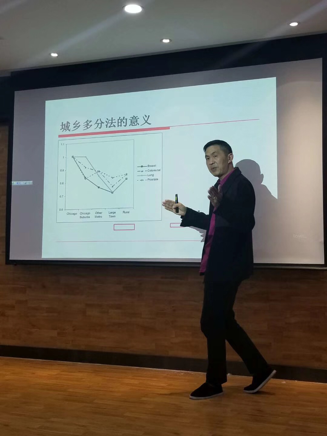 王教授通过结合交通流,以腾讯大数据(微信位置信息)为数据来源,提出了“中国 Urban Area草案 (2016)”,为我国现有城市划分方法提供了新的科学依据与方法。进而,王教授以美国卫生以及公共服务部主导的对美国当地不同城市人群健康状况的研究为例,详细介绍了芝加哥周边城镇为研究区域,不同人群的健康状况为研究对象,研究健康状况与城镇结构之间的关联,得出随着城镇化程度的提高,人们患癌症的几率逐步增加的结论,当地政府可以以此为依据,针对不同区域的患病风险来提出具有针对性的解决方案。以此引出美国城镇划分的详细程度高于我国,而且划分依据也与我国的行政依据向左。对此,王教授提出界定城乡的标准化要落实到小地域单元,并有明确的划分目的和依据,尤其要努力去行政化,来匹配个体行为的多元化。
