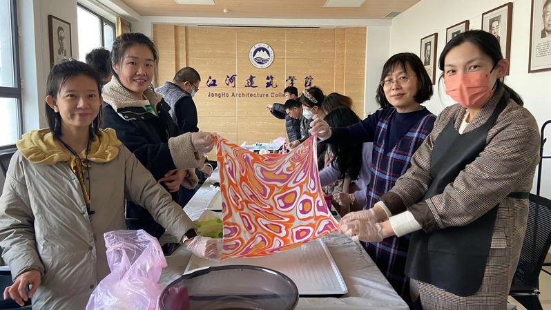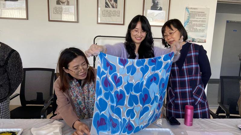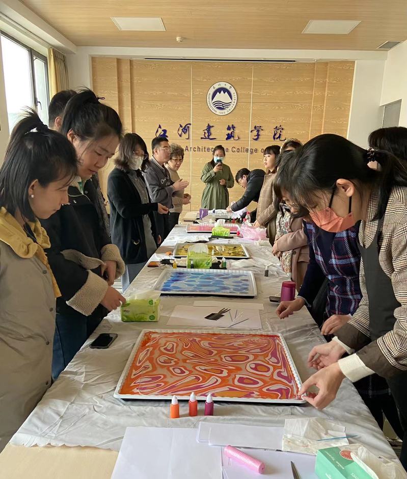 水拓,是一种古老的花纹制作技术,也称为大理石花纹纸艺术,目前已被列入世界非物质文化遗产代表名单。“水面作花,丝拓成画”,水拓的魅力,不限于其斑斓的色彩和神奇的技法,更在于每一幅作品,都是不可复制的艺术品,都散发着独特魅力。在现场,老师们热情洋溢、兴致勃勃,她们拿出平时做学问的热情,每个人都认真地制作自己的专属作品,尽情体验手工制作的喜悦。