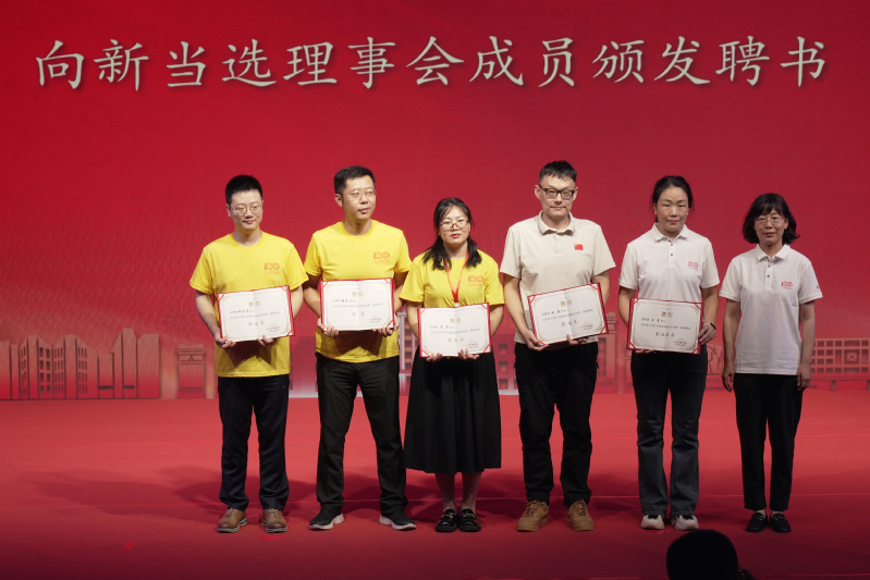 修春亮为江河建筑学院校友会首届会长张彦飞颁发聘书并授会旗。大会还为学院校友会副会长、秘书长及理事颁发了聘书。