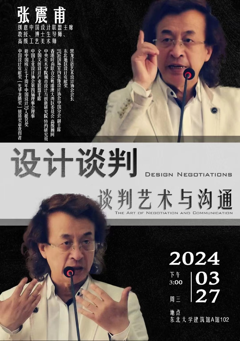 3月27日下午,学院席天宇教授邀请创意中国设计联盟主席张震甫在浑南校区建筑学馆A102作《设计谈判——谈判艺术与沟通》专题报告,欢迎各位老师和同学参加!