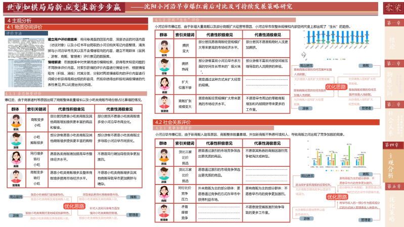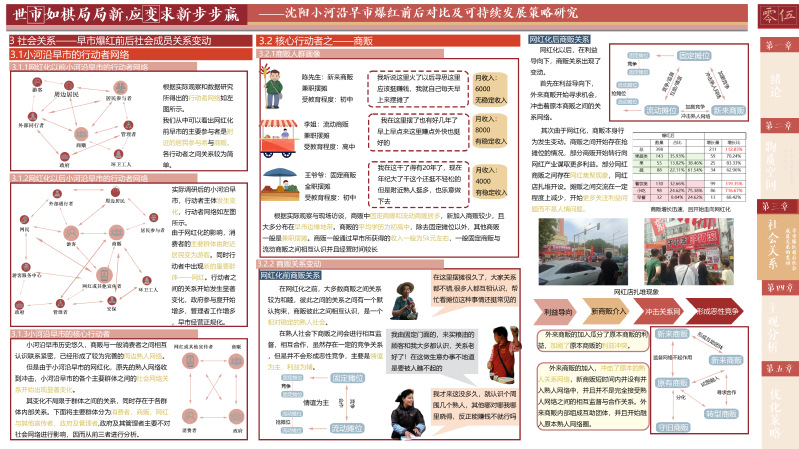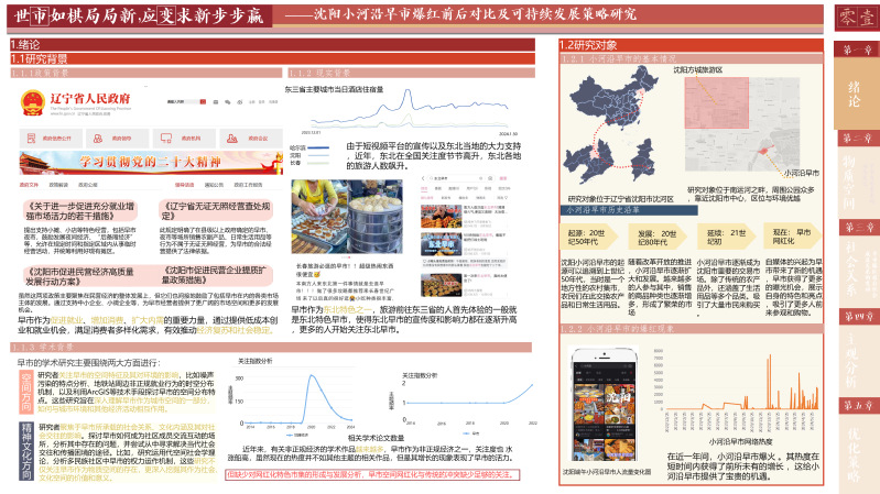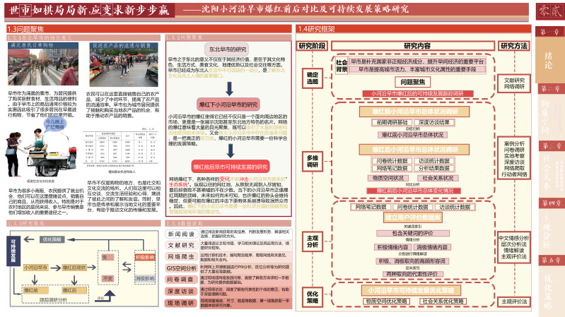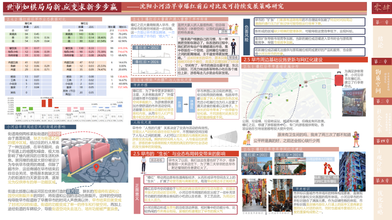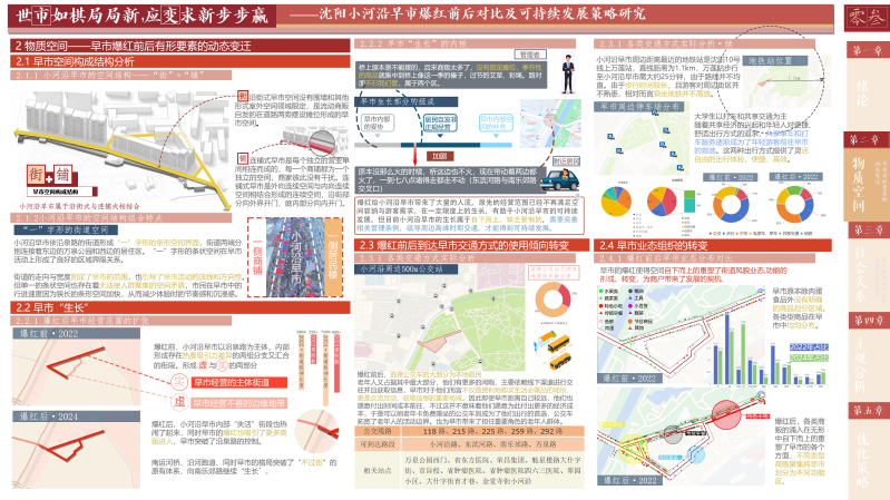 早市作为一种非正式经济,其每日的繁忙交易不仅为当地商贩提供了稳定的收入来源,还补充了地区经济的成分,是区域经济不可或缺的活力源泉。此外,早市不仅是购物的场所,更是东北文化的一张名片。它承载了丰富的民俗风情和历史记忆,吸引着游客和学者前来探寻,为地方文化的传播和传承提供了重要平台。本研究选取“大东北”网络走红下具有地域性和代表性,并且完整地经理了网络爆红全程的沈阳市小河沿早市作为研究对象。通过跨越爆红时间节点的前后两次调研对小河沿早市的爆红过程进行跟踪调研。通过工作日、双休以及节假日的多次问卷、访谈、观察调研,并结合网络爬取的方法,对小河沿早市爆红后总体状况进行调查。聚焦于物质空间、社会关系两方面的现状与旧况对比,并分别以商贩、管理者、周边居民、游客的用户评价其变化进行主观感受分析。最后总结提出小河沿早市爆红后可持续发展的优化策略。