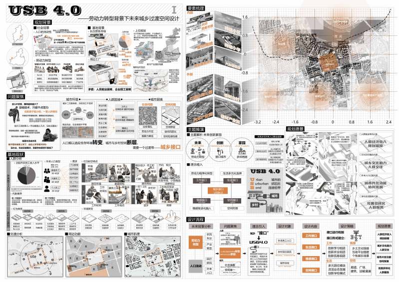 本设计场地位于城乡结合区域,面临着未来乡村人口向城市流动和劳动力转型的时代背景。考虑到劳务市场的变迁以及乡村回迁场地的现状,预计未来将有大量仅掌握原始劳动技能的乡村人口涌入城市。这部分人群在生存上将面临多重挑战:缺乏工作机会、难以适应城市的生活习惯,以及因离开故土而产生的深切思乡之情。这些问题进而可能导致城市凝聚力下降、治安状况恶化等社会问题。本设计特别关注这一特殊外来人群的工作、生活和情感需求,旨在通过设计三方面的城乡接口——工作接口、生活接口和情感接口,帮助他们实现从乡村到城市的生存过渡。同时,通过空间接口的设计,助力城市的协调发展,促进城乡之间的和谐融合。标题中的USB4.0象征着‘Urban Suburban Bond’——即城市与乡村的连接,它涵盖了上述的工作接口、生活接口、情感接口和空间接口,寓意着本设计致力于构建USB接口,连接城乡,促进两者的共同发展与繁荣。”