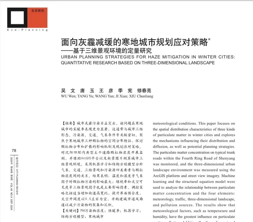 近日,我院城乡规划系吴文副教授团队在CSSCI期刊《城市规划》上发表题为“面向灰霾减缓的寒地城市规划应对策略——基于三维景观环境的定量研究”的论文。该研究成果以东北大学江河建筑学院为第一完成单位,吴文副教授为第一作者,修春亮教授为通讯作者,该成果的合作作者还有硕士研究生唐玉、博士研究生王彦以及讲师季宪。