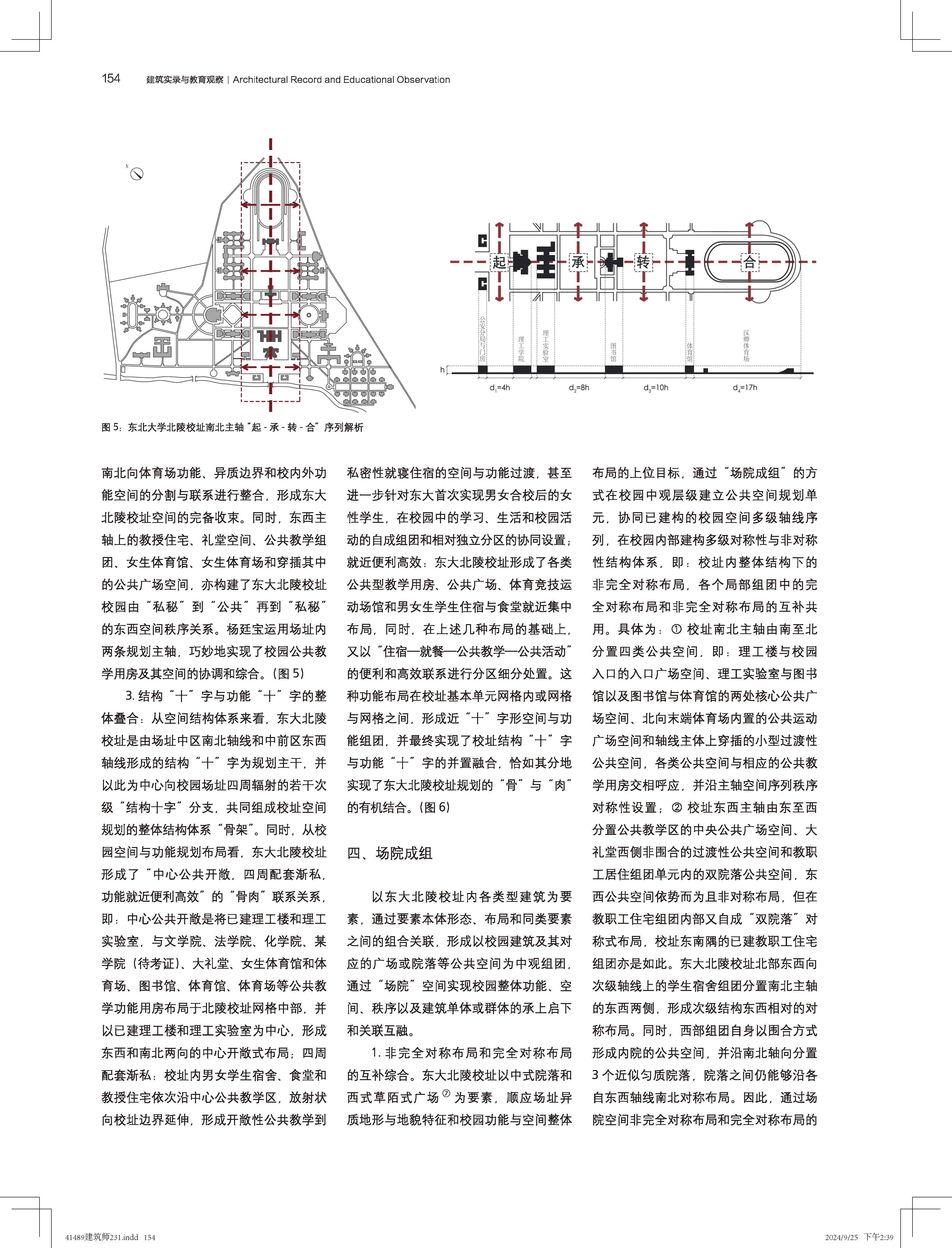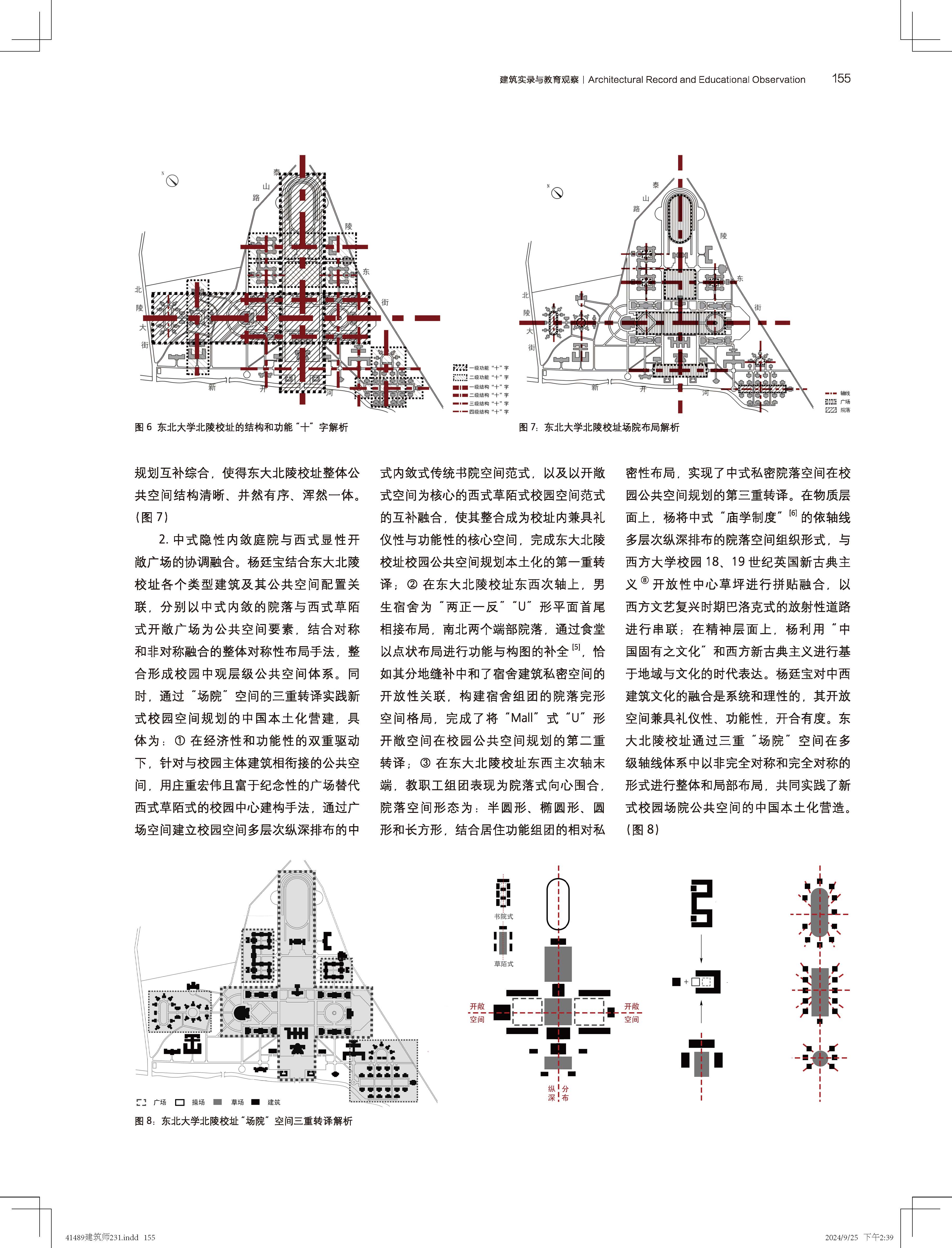 第二篇文章以东北大学北陵校址为研究对象,东北大学北陵校址是杨廷宝留学归国完成的第一个本土校园规划,也是第一个由中国建筑师设计的本土大学校园规划,该规划既是我国早期校园规划引入“布扎艺术”的新古典主义中国式融合典例,也是杨廷宝“大综合、大协调”设计理念与方法的经典案例。文章以“大综合、大协调”的视角,从“依址谋划”、“十轴建序”、“场院成组”和“折中立貌”四个维度,解读杨廷宝东大北陵校址的规划设计逻辑、设计策略及其致因,旨在为我国当代和未来校园空间规划实践提供基础理论和策略参考,亦尝试对杨廷宝在我国近现代时期的经典校园空间规划实践案例的进一步考证,启发后学者的专业教育教学与实践。