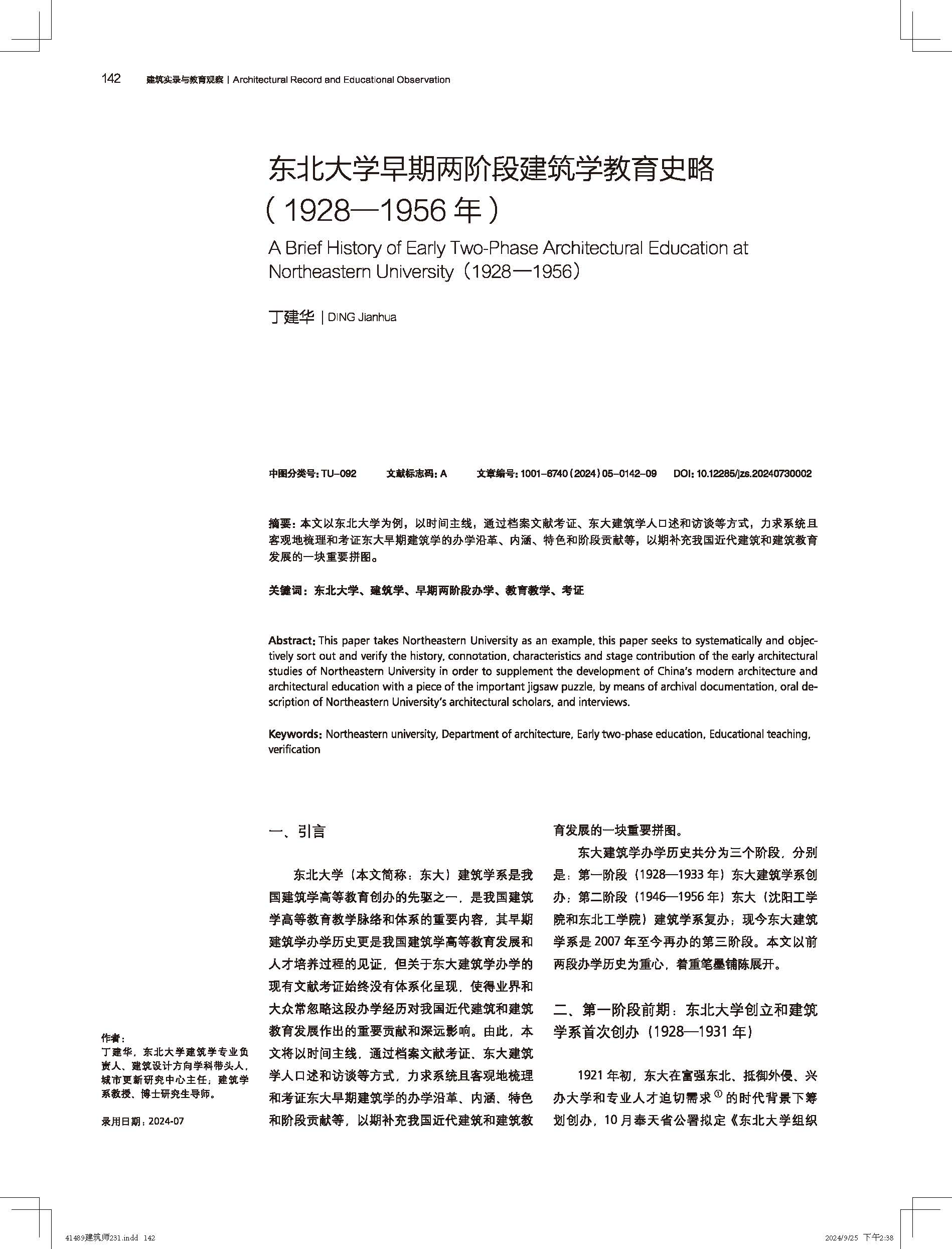 近日,我院教授丁建华及其团队在《建筑师》首个“行业实录与建筑观察”专栏连载两篇学术论文,分别为:《东北大学早期两阶段建筑学教育史略(1928-1956)》、《综合与协调——杨廷宝东北大学北陵校址空间规划的形成与解析》,两篇文章研究成果均以东北大学为第一完成单位,丁建华教授分别为独立作者和第一兼通讯作者,其中一篇,合作作者为吴颖怡、郭梦锦和孟臻高级工程师。