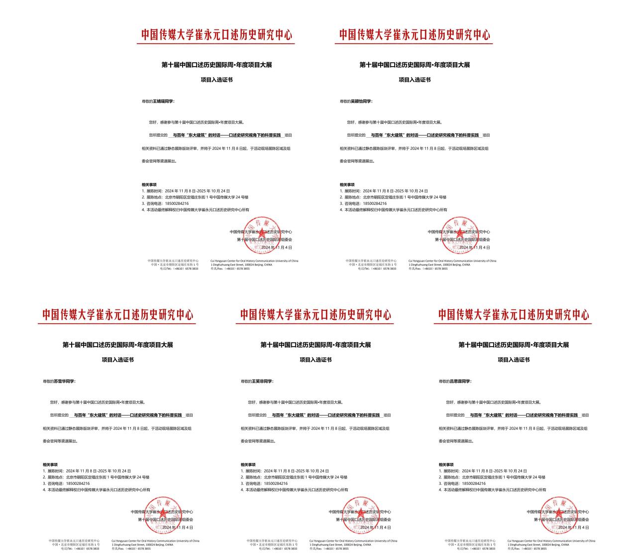 第十届中国口述历史国际周年度项目大展我院项目参展入选证书