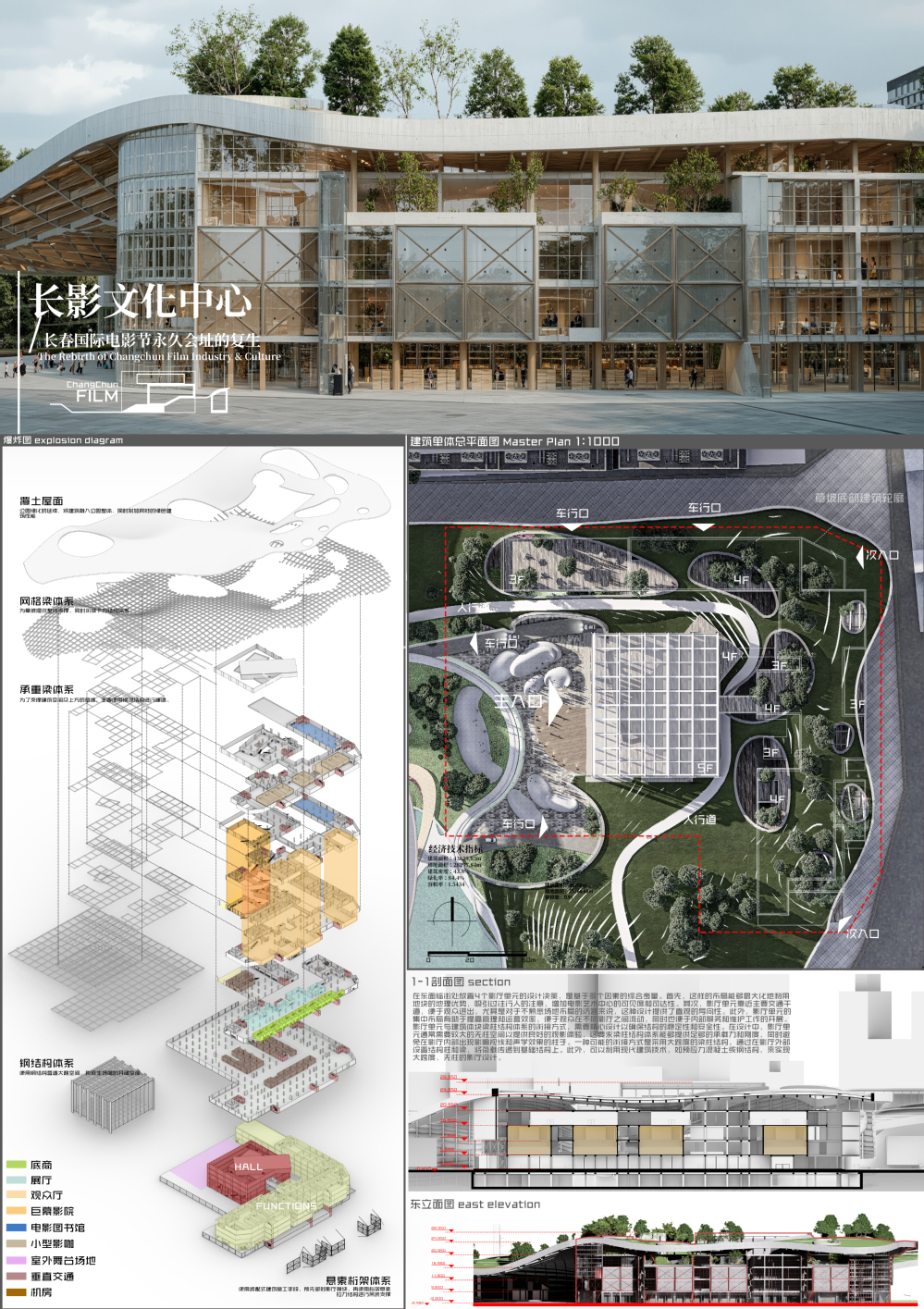 建筑设计旨在复兴长春电影文化,回应场地电影文脉,让失去永久会址的长春国际电影文化节复生;同时结合城市公园属性,迎合总体城市设计规划,形成融入公园绿化的城市文化新地标;考虑长春寒地气候和覆土建筑、种植屋面性质,使用在种植土层下使用导热系数低的材料作为防冻土层等构造设计方式进行回应。