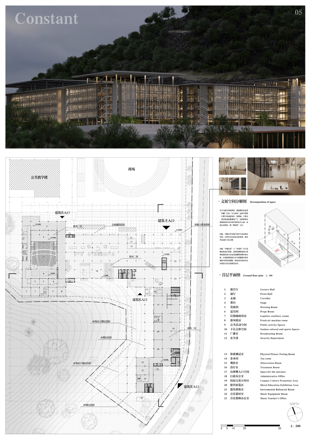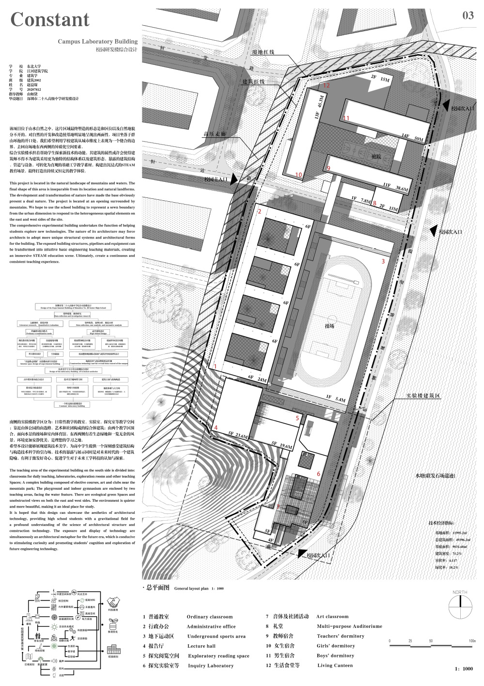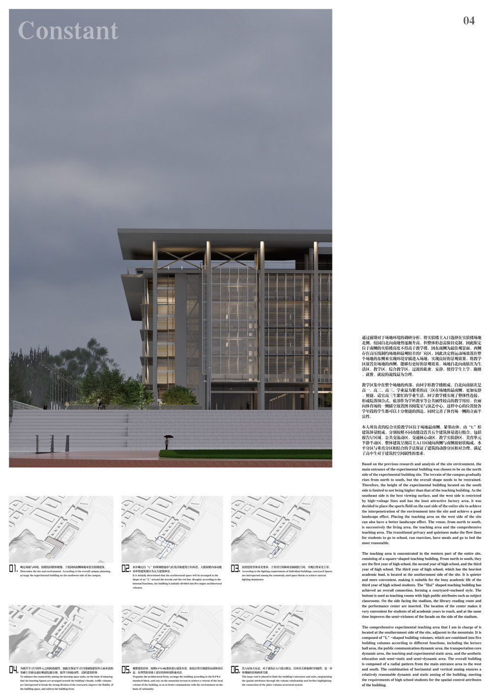 设计场地位于城市与自然边界,城市活力与自然静谧为最大的特征。在这里,得以依托教育摒弃复杂的概念,重链结构与建筑原作的关联,从而深刻地揭示出场所精神。南侧的实验楼教学区展现建筑技术美学,为高中学生提供一个深刻感受建筑结构与构造科学的引力场,结构与设备的暴露与展示是对未来时代的一个建筑隐喻,促进学生对于未来工学的认知与探索。