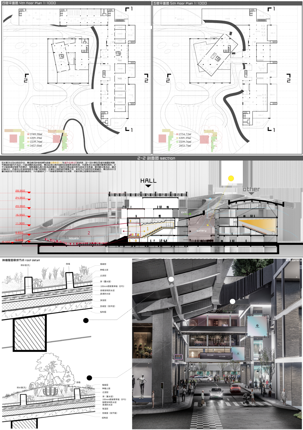 场地位于长春市绿园区的长春电影城公园旧址,立足于寒地城市产业存量更新议题,通过城市设计和建筑单体设计方式,实现文化传承与功能创新的融合。设计考虑解决周边及场地内部的混乱肌理,采用覆土建筑形式,营造整体性强的城市公园生态综合体,与周边商圈形成集群效应,为周边居民和游客提供休憩空间。内部空间充分利用自然光,提升体验感,同时设置步行道和景观节点,增强环境互动性。