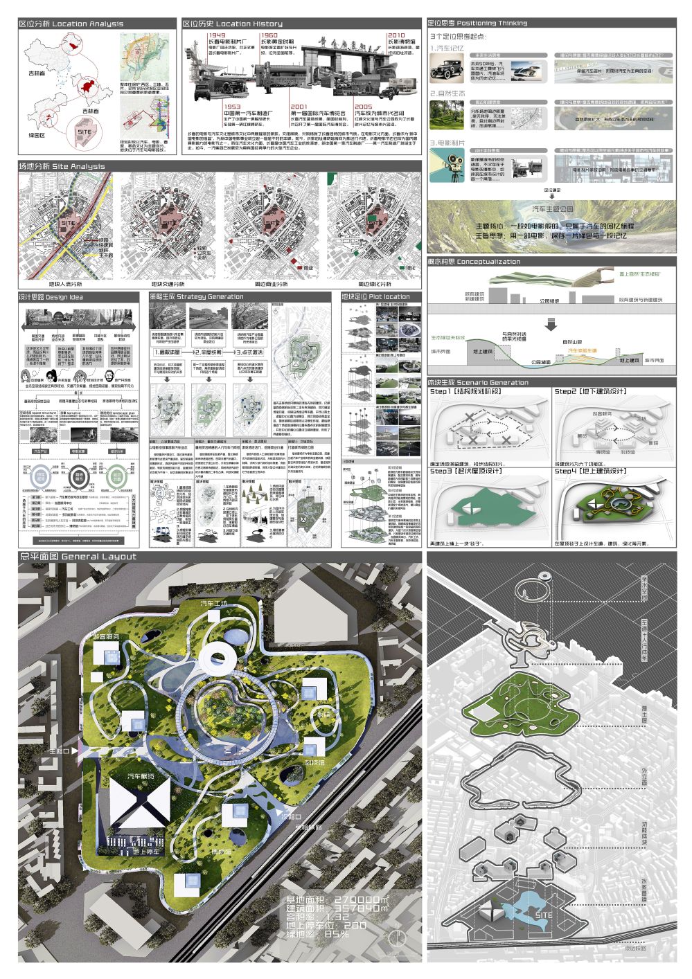 项目基地位于吉林省长春市电影城旧址,依托城市工业文化基因与电影艺术底蕴,旨在打造一座融合汽车工业主题、文化体验与公共生活的新型复合空间。设计以“工业记忆再生”为核心理念,通过覆土建筑形态与架空环廊的立体化空间叙事,回应长春汽车工业发展历程,屋顶覆土坡道与景观自然衔接,形成生态史与电影文化特色:建筑主体采用覆土形势呼应园区步道系统,下方形成公共广场,顶部覆土界面兼具节能效益;首层抬升的环形架空廊道与车道无缝对接园区交通,实现人车分流。功能布局上,沿街以退台层叠的商业体块延续城市生活服务,植入文创、餐饮等业态激活片区活力;内部纵向分区涵盖汽车服务工艺展示、创客空间等功能,并通过天窗体系与风廊组织优化光环境与通风效率。建筑以锈蚀钢板、玻璃幕墙与钢结构演绎工业美学,保留齿轮雕塑等遗迹形成“记忆长廊”,最终构建一处缝合城市肌理、对话历史与未来的文化地标。