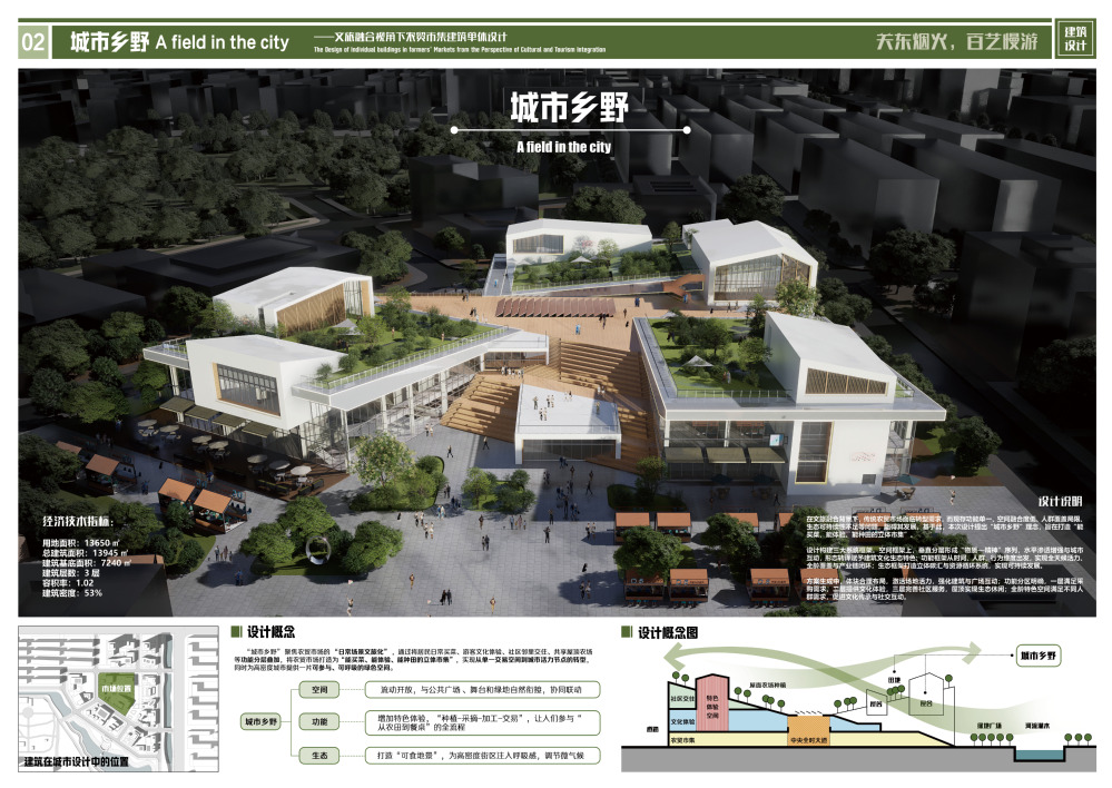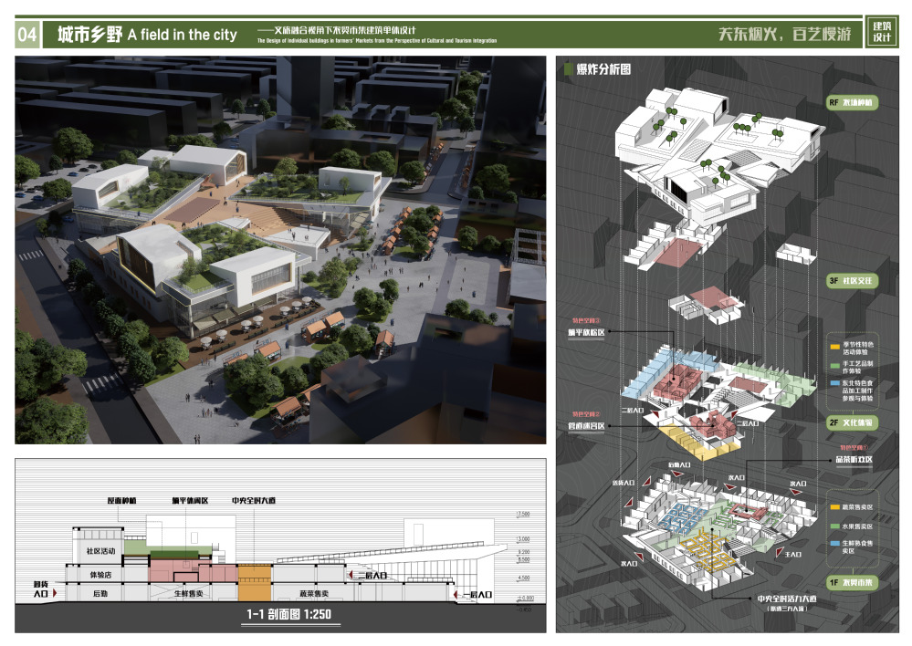 设计聚焦沈阳市迎春早市,从文旅融合视角展开农贸市场转型升级的城市设计与建筑单体设计。项目位于沈阳核心发展板块,周边居住区与商场众多,客源丰富但竞争大,同时拥有迎春湖和公园的生态资源。城市规划设计部分,针对场地面临的诸多困境与问题,项目计划以文旅融合视角,规划整合早夜市、农贸市场等东北文化特色市集,打造一个集生态休闲、文化体验与市井烟火于一体的城市活力片区,满足周边居民日常生活需求的同时,吸引游客沉浸式感受东北民俗风情。基于定位,以“五态重塑”为理念,从生态、业态、形态、社态和文态五个方面推进。建筑单体设计选取农贸市集,针对传统农贸市场服务人群、空间、功能、生态等方面的问题,提出“城市乡野”设计概念,通过聚焦如何将农贸市场的“日常场景文旅化”的问题,计划将其打造为“能种田、能加工、能买菜的立体农贸市集”。设计将居民日常买菜、游客文化体验、社区邻里交往、共享屋顶农场等功能分层叠加,实现从单一交易空间到城市活力节点的转型,同时为高密度城市提供一片可参与、可呼吸的绿色空间。空间上,水平垂直双向增加开放性,呼应城市空间;功能上,一层保留交易功能,满足居民日常购物需求,二三层分别针对游客和居民设置文化体验和社区活动功能,同时为满足老中幼等不同年龄段人群的需求,设置了不同的特色体验空间;生态上,通过屋顶种植、雨水收集与利用等生态设计,提升了建筑的可持续性。